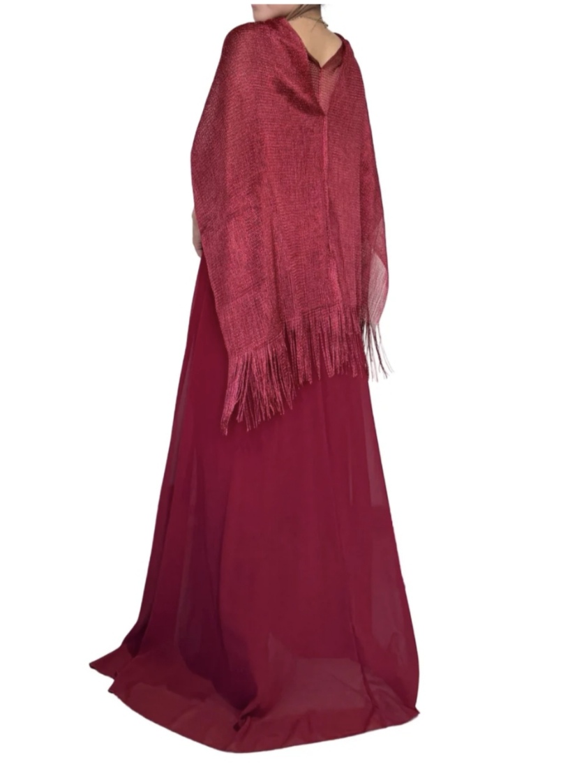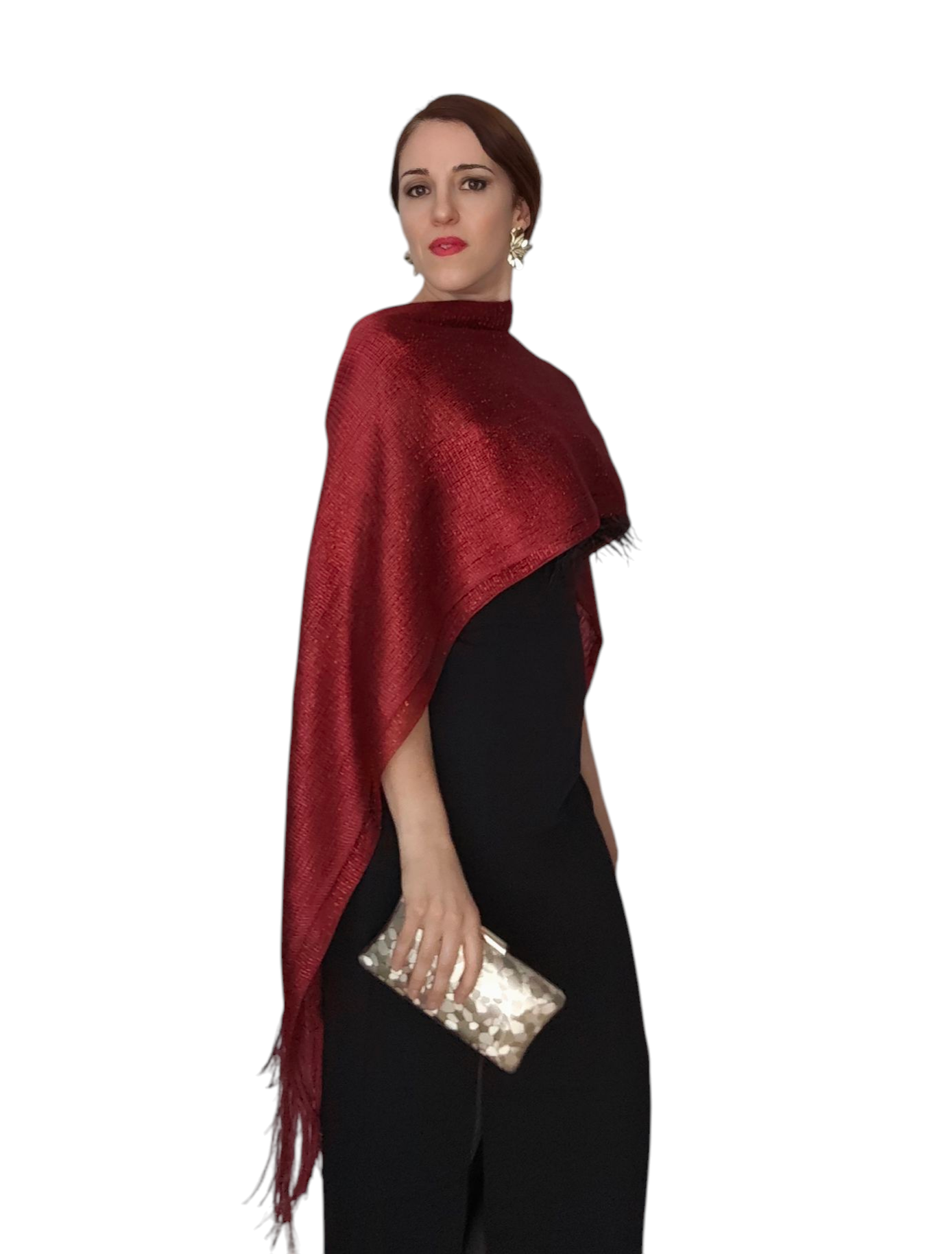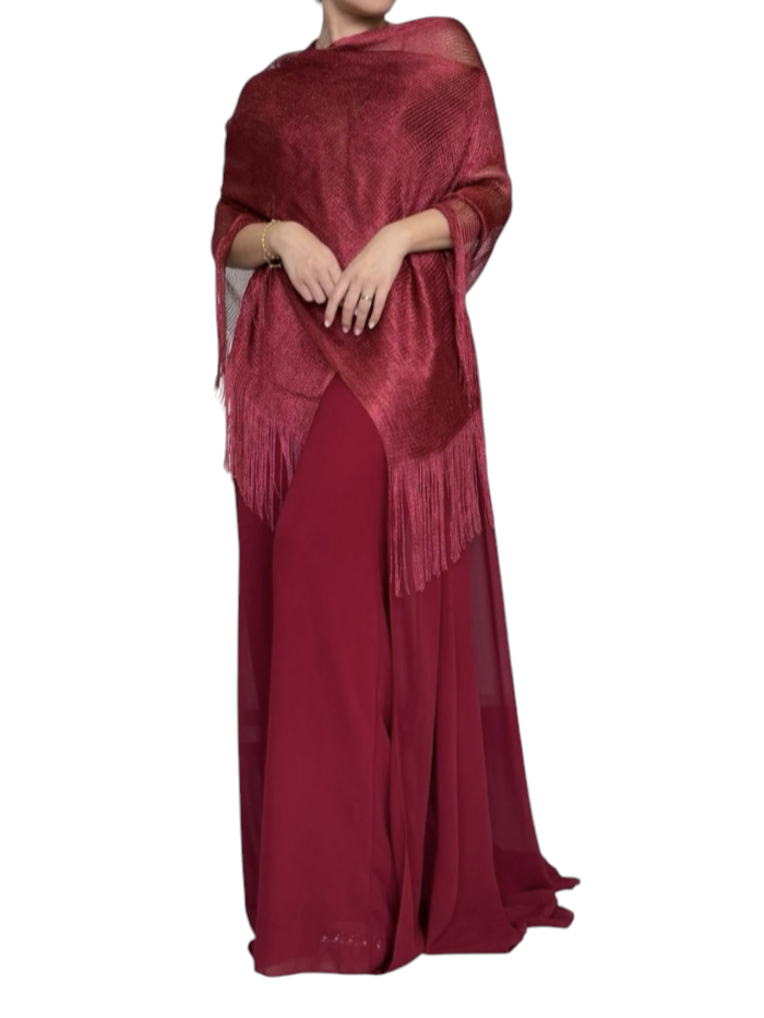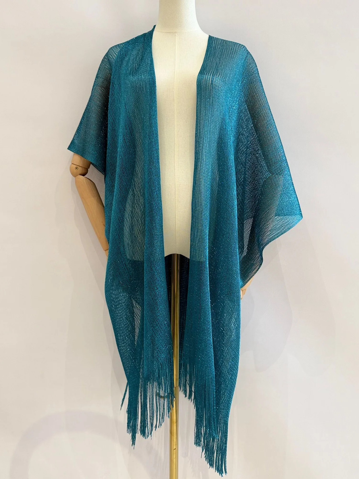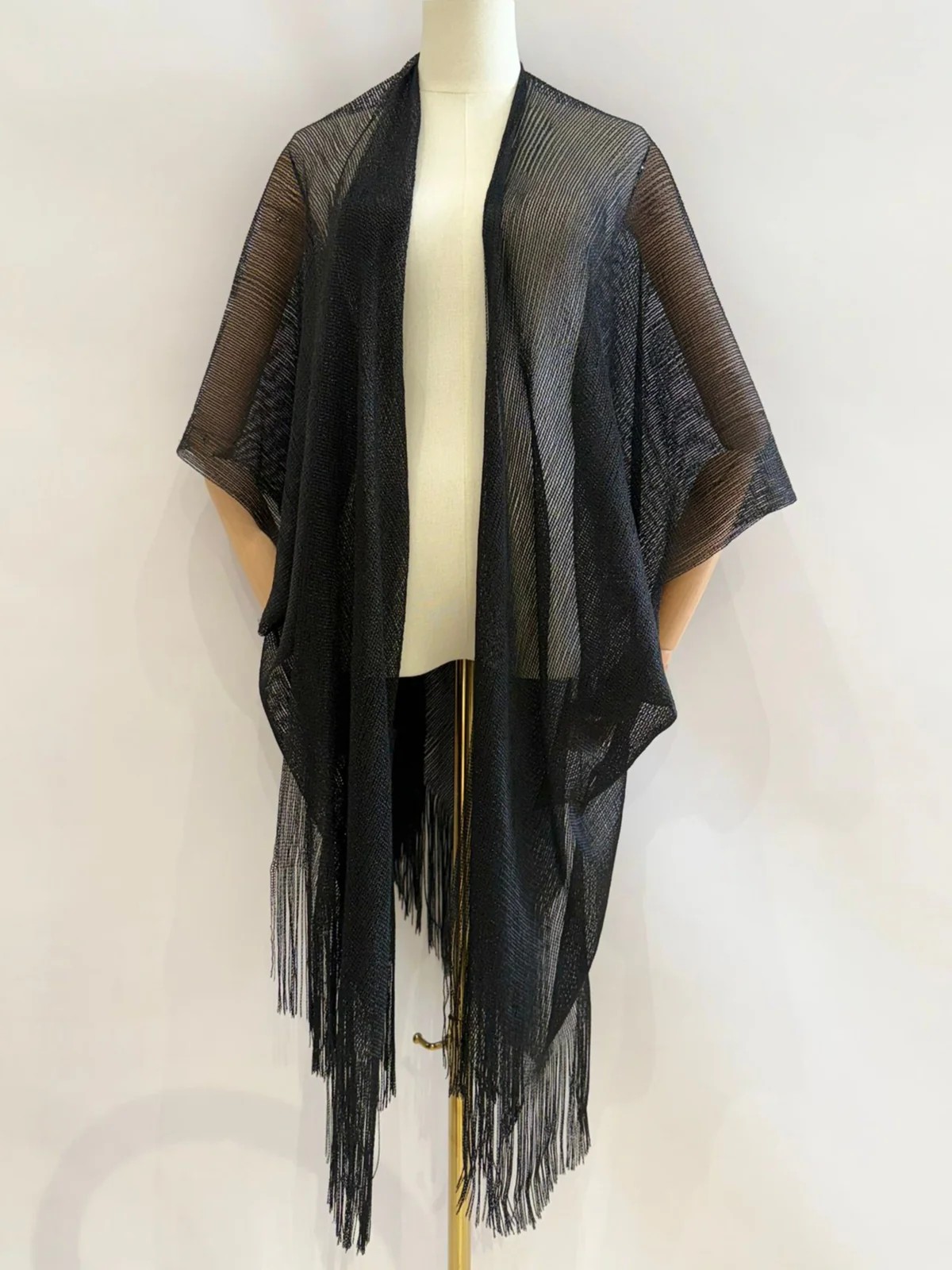 Descubre el kimono capa multiposición con flecos, ideal para invitadas de boda y eventos. Versátil, elegante y disponible en dorado, oro rosa, burdeos, negro y azul petróleo. Eleva tu look con estilo. El complemento perfecto para eventos, bodas y ocasiones especiales.