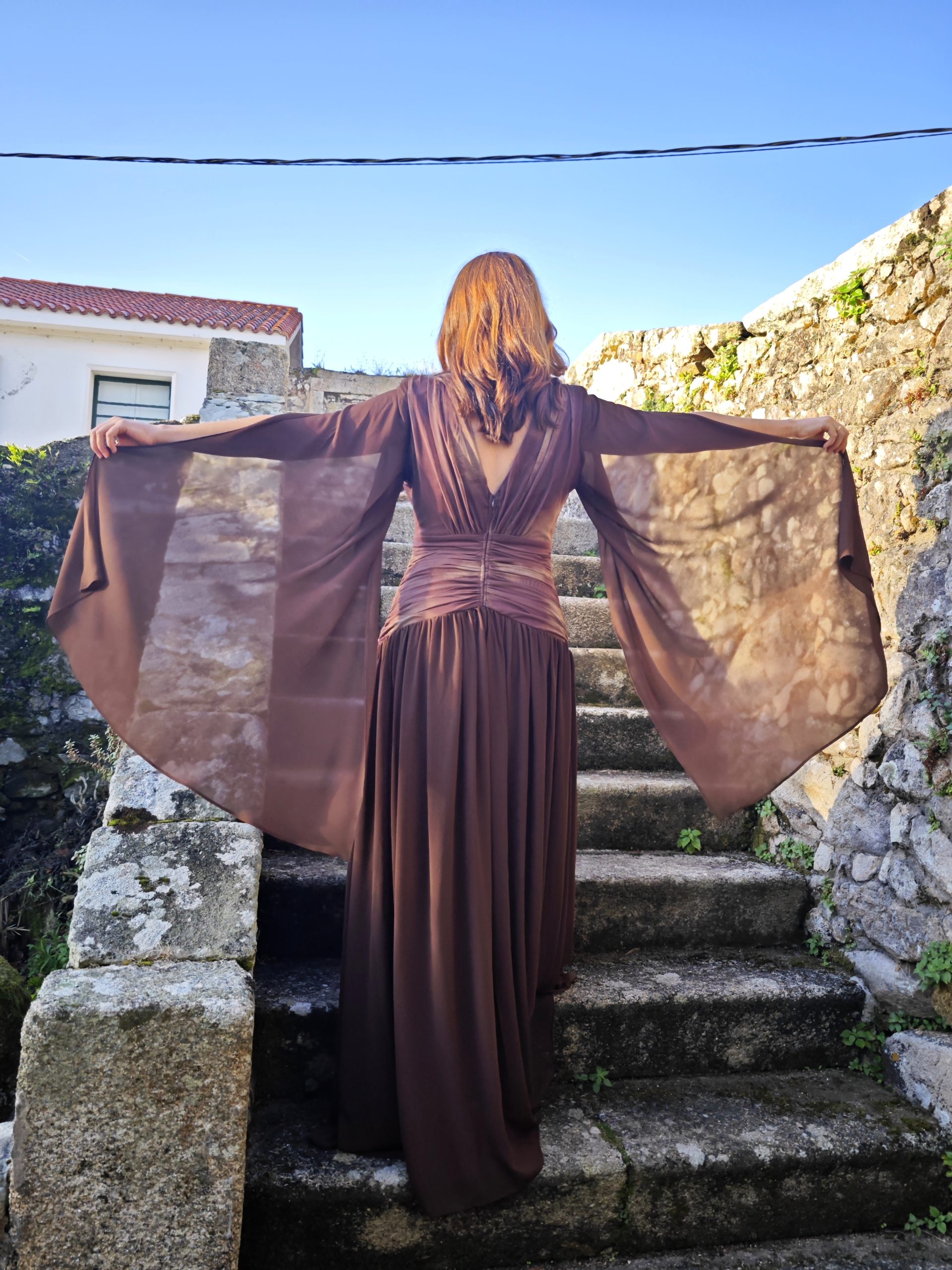 El vestido Helena es pura elegancia: cuerpo en modal que se ajusta perfectamente, falda de crepe ligero, mangas capa, copas incorporadas y ligeras hombreras que estilizan. Disponible en tallas XL a 4XL (42-48) y en azul marino, buganvilla, verde botella y marrón.