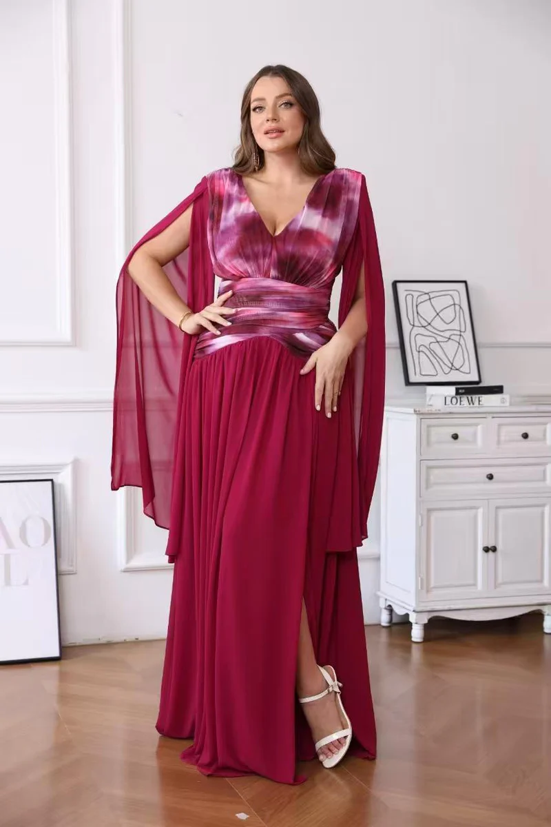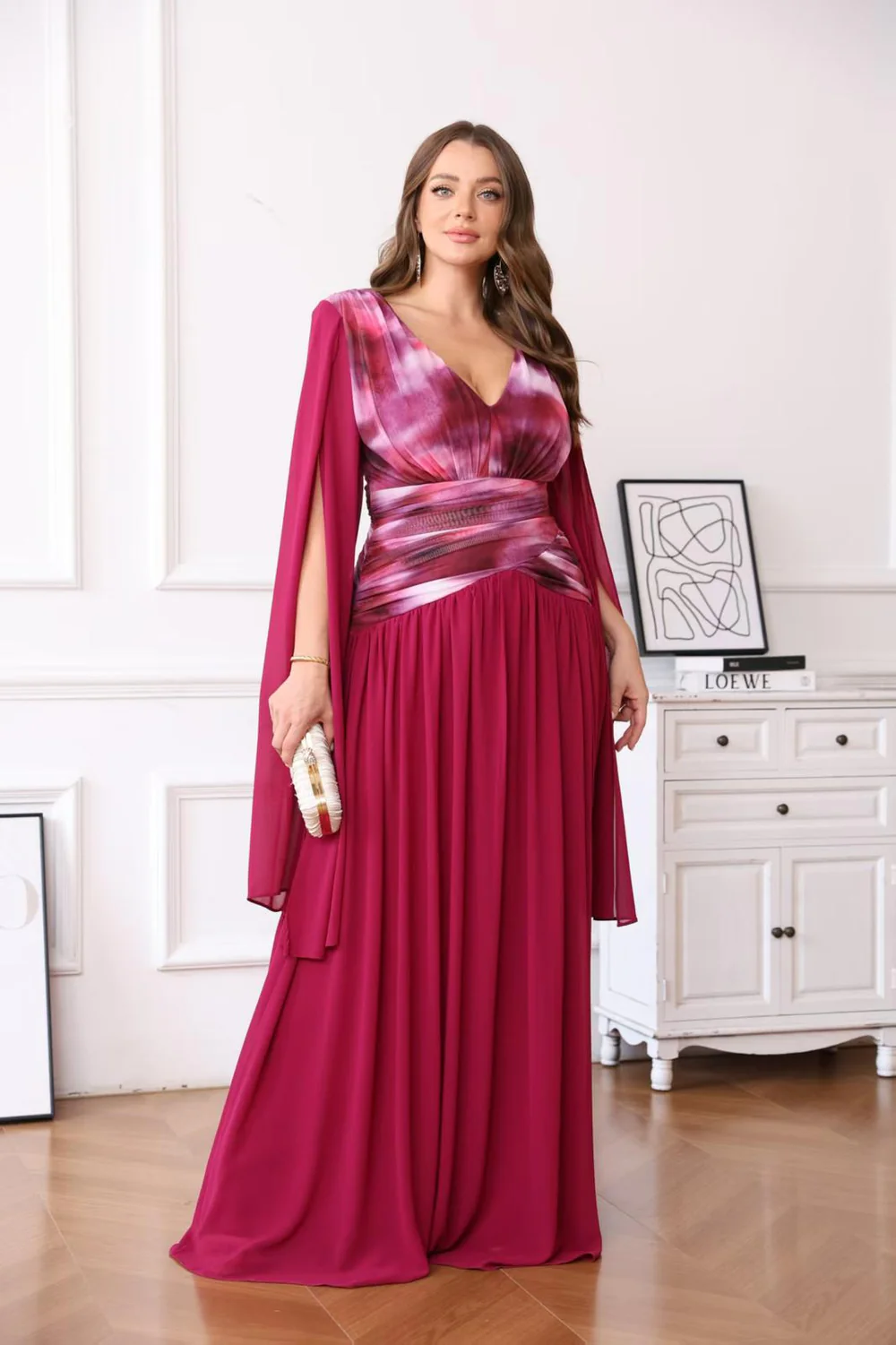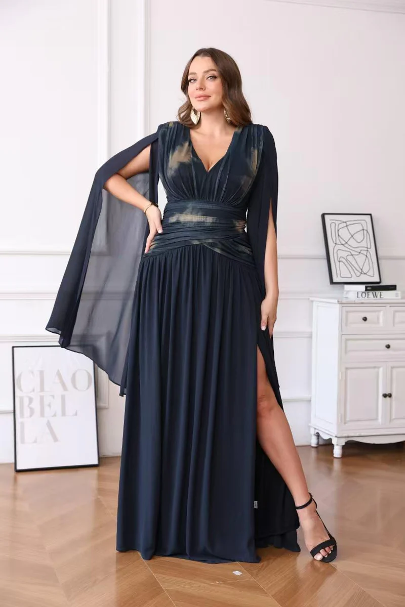 El vestido Helena es la nueva versión del aclamado modelo Zafira, ahora con mangas capa que aportan movimiento y sofisticación, convirtiéndolo en una elección perfecta para invitadas curvy que buscan estilo y comodidad en sus looks de tallas grandes.