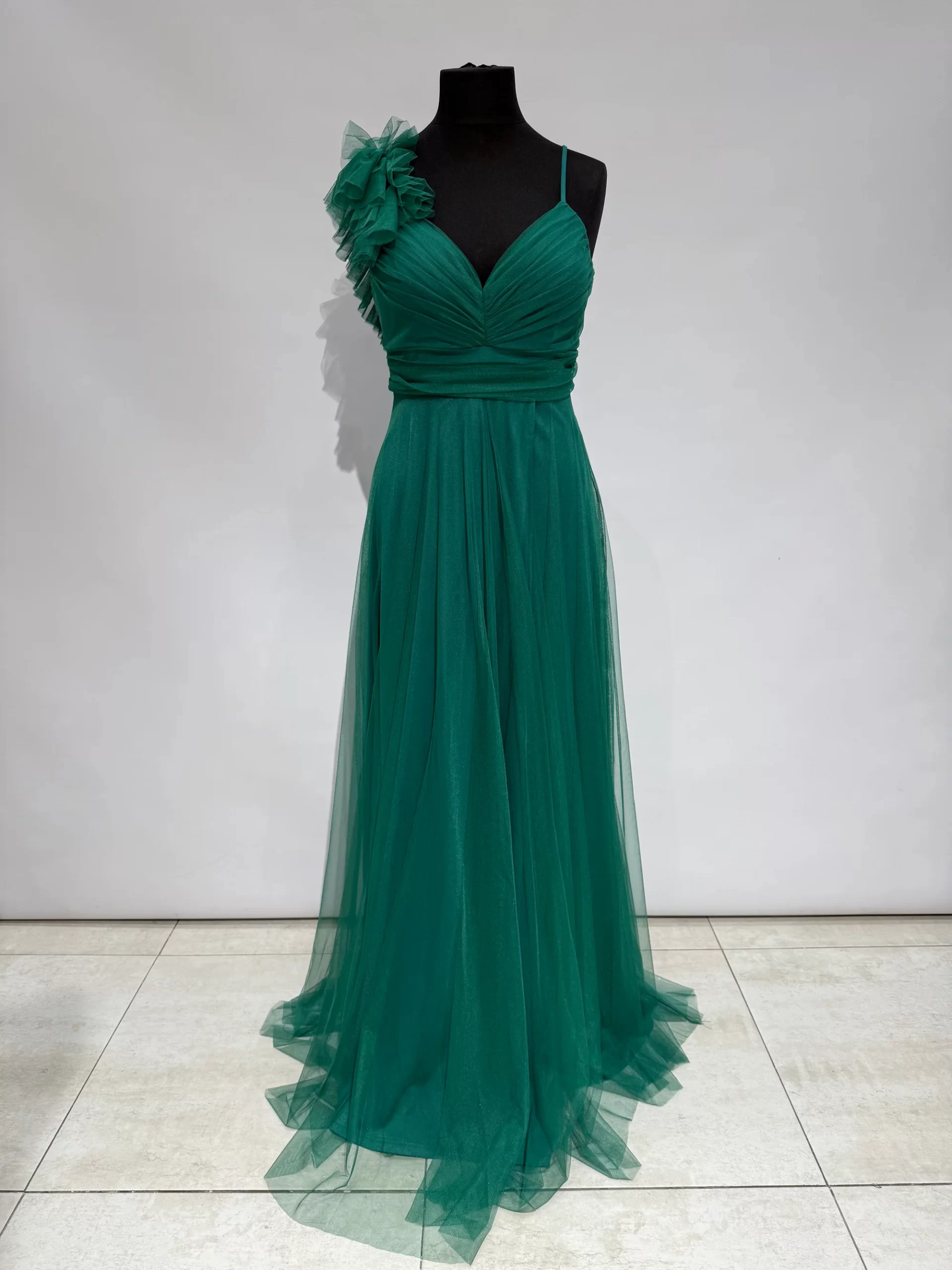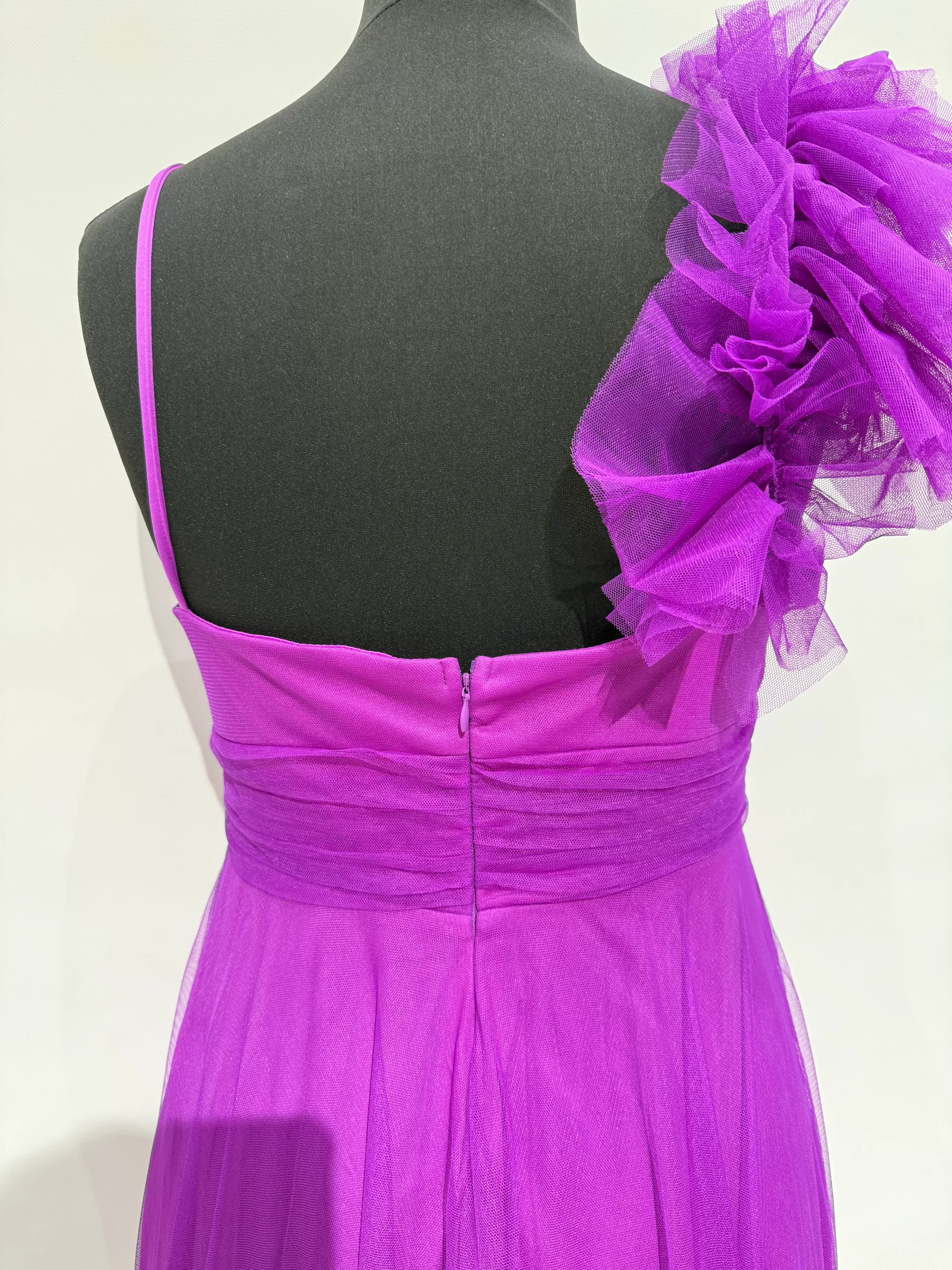 Impresiona como invitada con este vestido largo de tul, diseñado para realzar la silueta de mujeres con curvas. Su favorecedor escote en pico, la delicada caída de la falda y el espectacular detalle en un solo hombro hacen de este diseño una opción ideal para bodas de tarde, eventos especiales o galas.