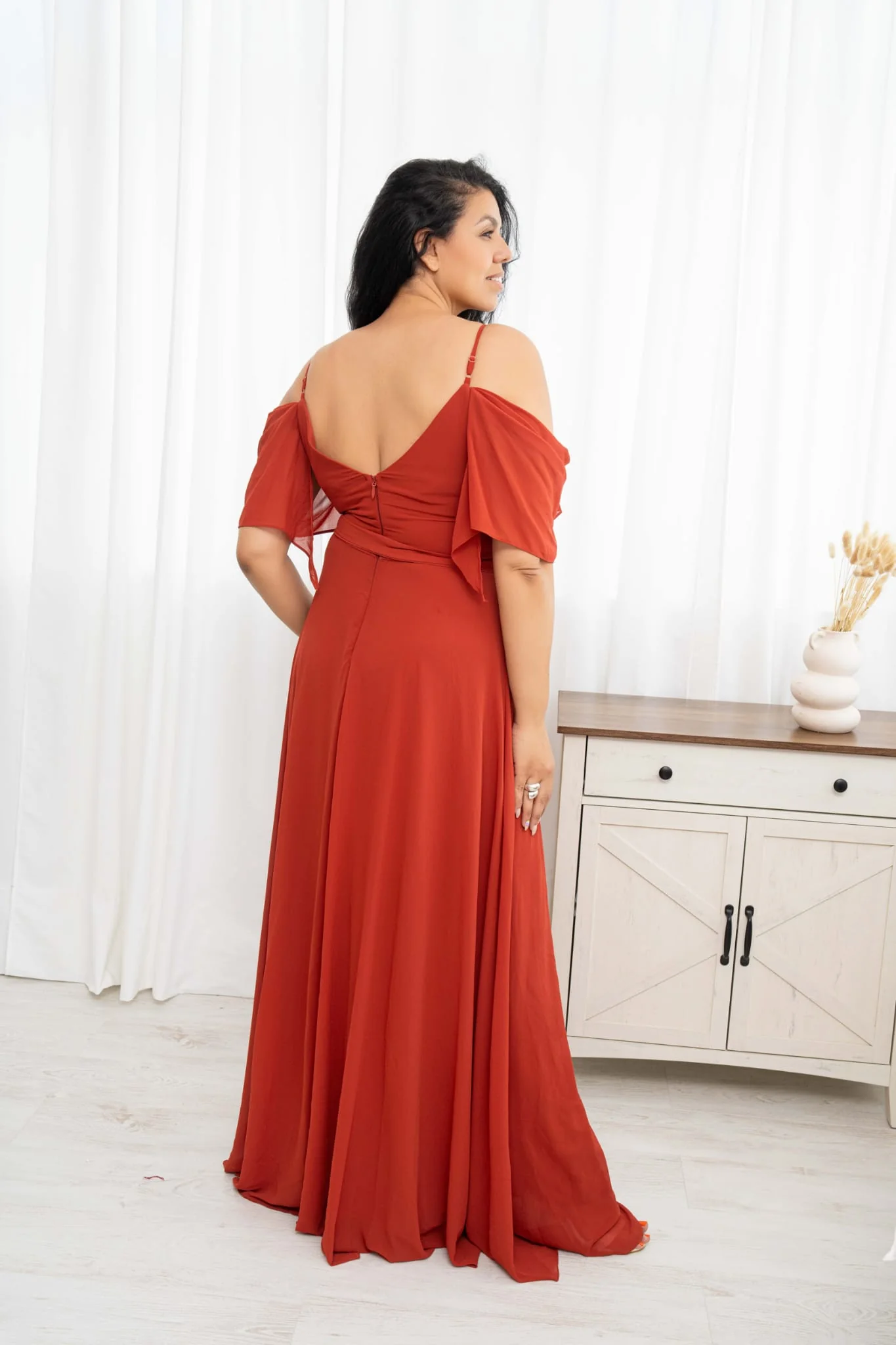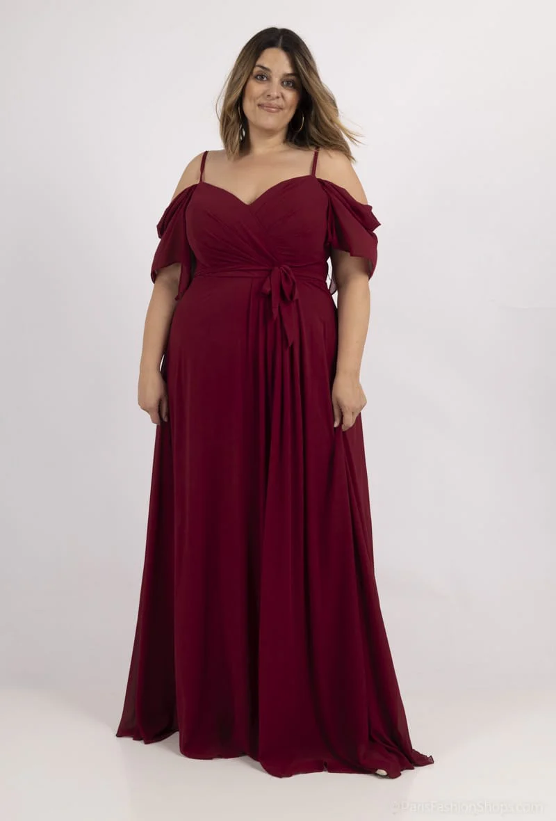 Vestido de invitada en tallas grandes con escote en pico, hombros descubiertos y lazada que estiliza. Disponible en teja, verde oliva y burdeos desde la XL hasta la 6XL. Perfecto para bodas y celebraciones. Descubre más detalles: